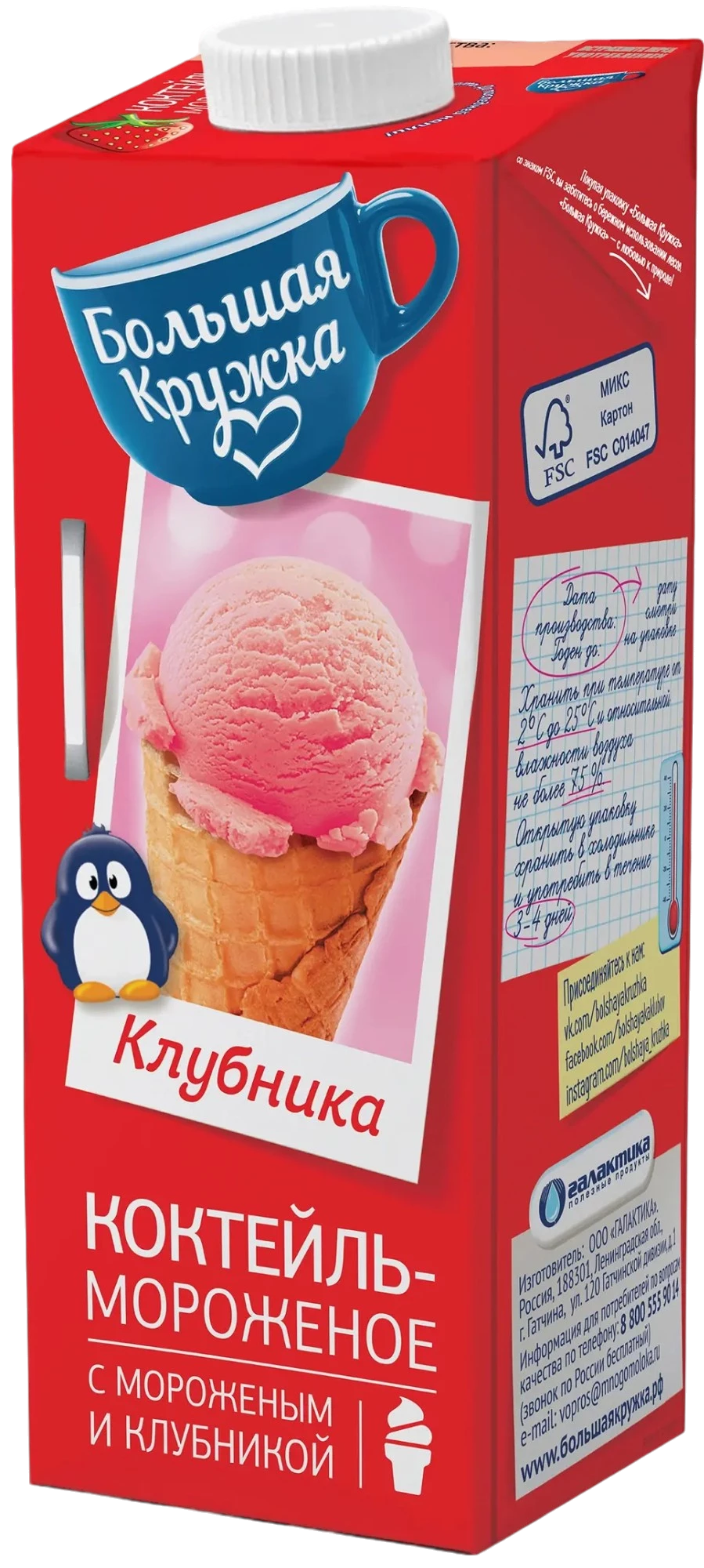 Коктейль Большая Кружка молочный с клубникой и мороженым 3% 0,98л БЗМЖ