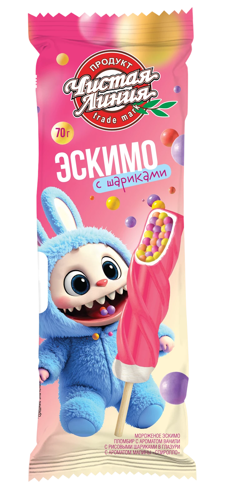 «Чистая Линия» представляет эскимо с ароматом малины, которое сочетает традиционную нежность пломбира и хрустящие рисовые шарики. Сверху это лакомство покрыто тонким слоем розовой глазури. Оно создаётся по классическому рецепту с использованием натурального коровьего молока, а его уникальность заключается в необычном сочетании текстур. Идеально для тех, кто ищет привычный вкус с изюминкой.