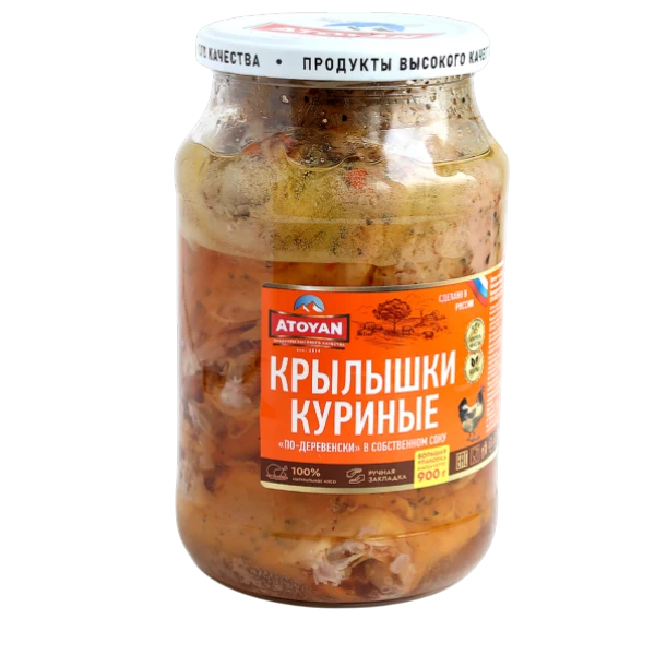 «Крылышки по-деревенски ATOYAN» — это готовое гастрономическое решение для тех, кто ценит натуральный вкус домашней кухни, но не хочет тратить время на долгую готовку. Продукт томится в собственном соку с добавлением классических специй, что позволяет сохранить сочность и нежность мясных волокон. Уникальность технологии заключается в бережной термической обработке, благодаря которой мясо легко отделяется от кости, приобретая насыщенный аромат. Это идеальный вариант для быстрого и сытного ужина, а также отличная основа для походного меню или загородного пикника.