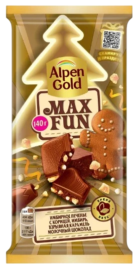 Alpen Gold бренд №1 – ещё больше веселья для Нового года! А интерактивная упаковка не оставит никого равнодушным и позволит украсить всё вокруг! Alpen Gold Max Fun «Морозный имбирь и ароматная корица» – это засахаренные кусочки имбиря, корица, шипучие шарики и взрывная карамель в молочном шоколаде, которые перенесут вас в настоящее европейское Рождество!
