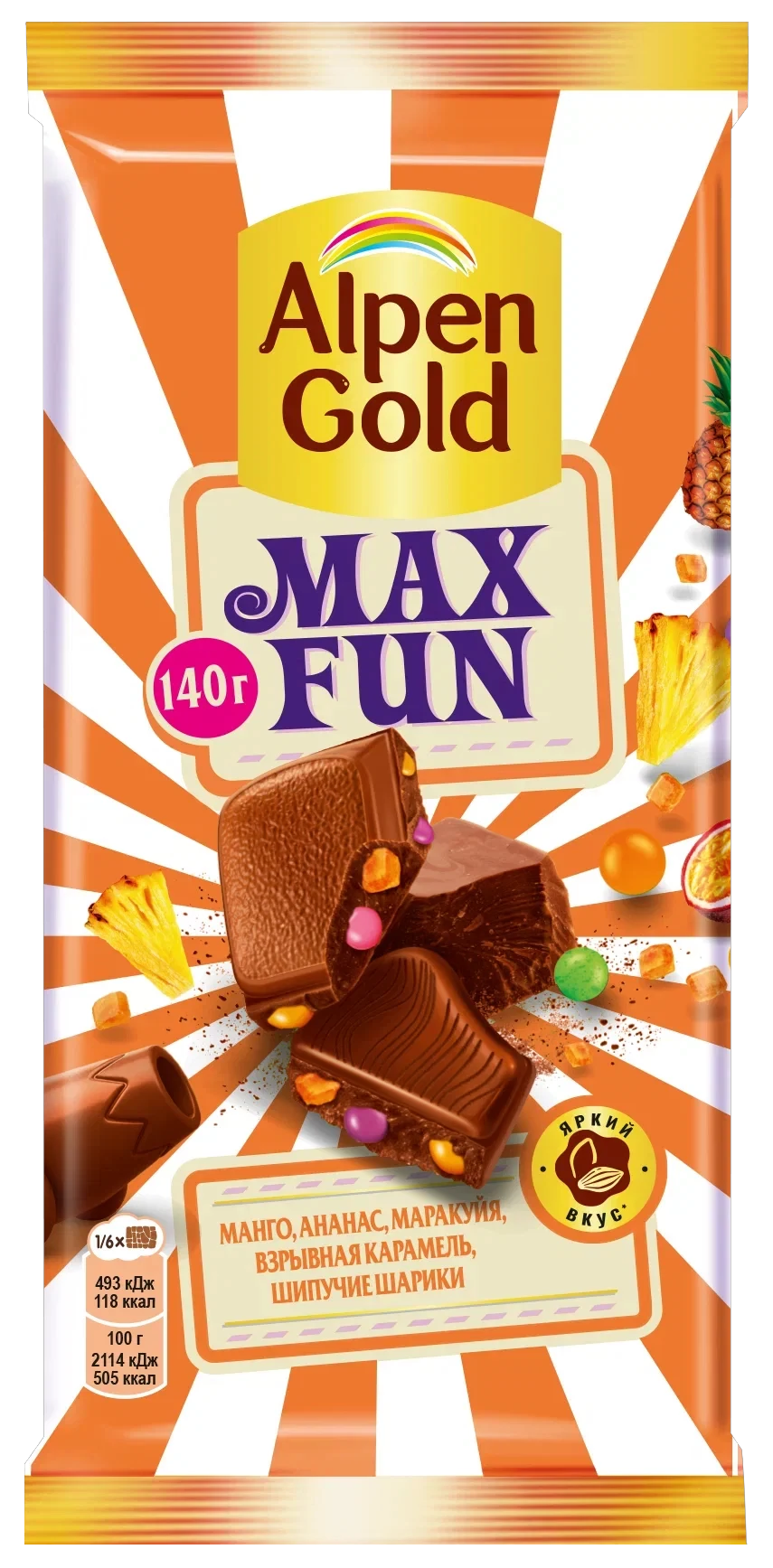 «Alpen Gold Max Fun» представляет собой плиточный молочный шоколад, отличающийся сложным и многогранным наполнением. Классическая молочная основа дополнена комбинацией тропических фруктовых кусочков манго, ананаса и маракуйи, обеспечивающих сбалансированную кислинку. Включение шипучих рисовых шариков и взрывной карамели обеспечивает уникальный контраст вкусов и текстур.
