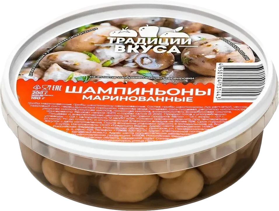 Вопросы о товаре Шампиньоны маринованные 200 гр Традиции вкуса