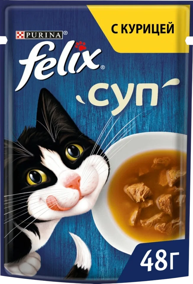 Суп «Felix» с курицей — это аппетитное дополнение к ежедневному рациону вашей кошки, которое на 100% удовлетворит её особую любовь к бульону и нежным кусочкам куриного мяса. Рецепт представляет собой лёгкий куриный суп, приготовленный по уникальной технологии с сохранением натурального вкуса и аромата. Этот суп — идеальный способ не только побаловать питомца, но и обеспечить дополнительное потребление жидкости, что крайне важно для здоровья почек. Предложите его между основными приёмами пищи как лакомство, и ваша кошка будет просто в восторге.