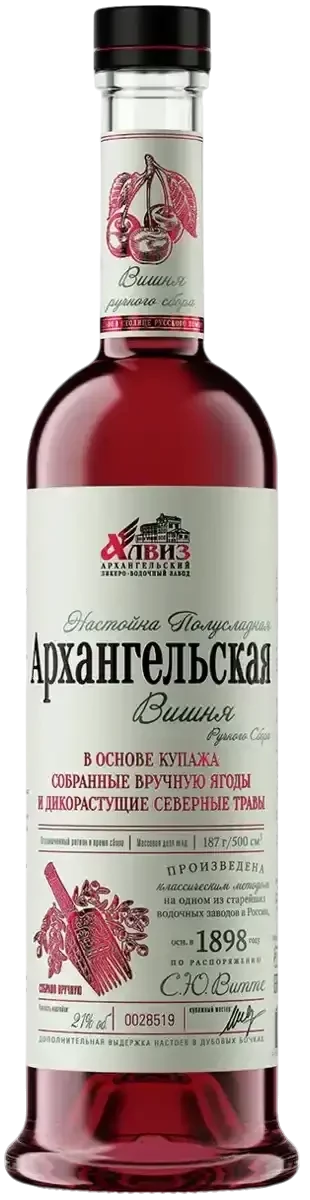 Настойка «Архангельская Вишня» — это гармоничное сочетание классических традиций и натурального ягодного вкуса. В основе настойки — вишнёвый сок и спирт класса «Люкс». Её отличает мягкий характер и насыщенный вкус спелой вишни. Настойка сохраняет баланс между фруктовой сладостью и лёгкой горчинкой, характерной для натуральной ягоды. Подойдёт как для уютного вечера в кругу близких, так и в качестве элегантного дополнения к застолью или десерту.